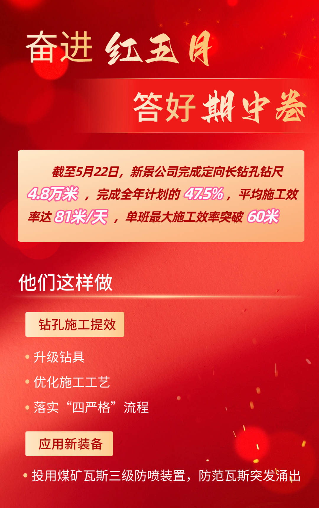 千米定向钻进技术是华阳集团治理瓦斯的重要技术手段。今年以来,新景公司积极推进千米定向钻机应用,截至5月22日,完成钻尺4.8万米,完成全年计划的47.5%,千米钻机定向钻进显成效。