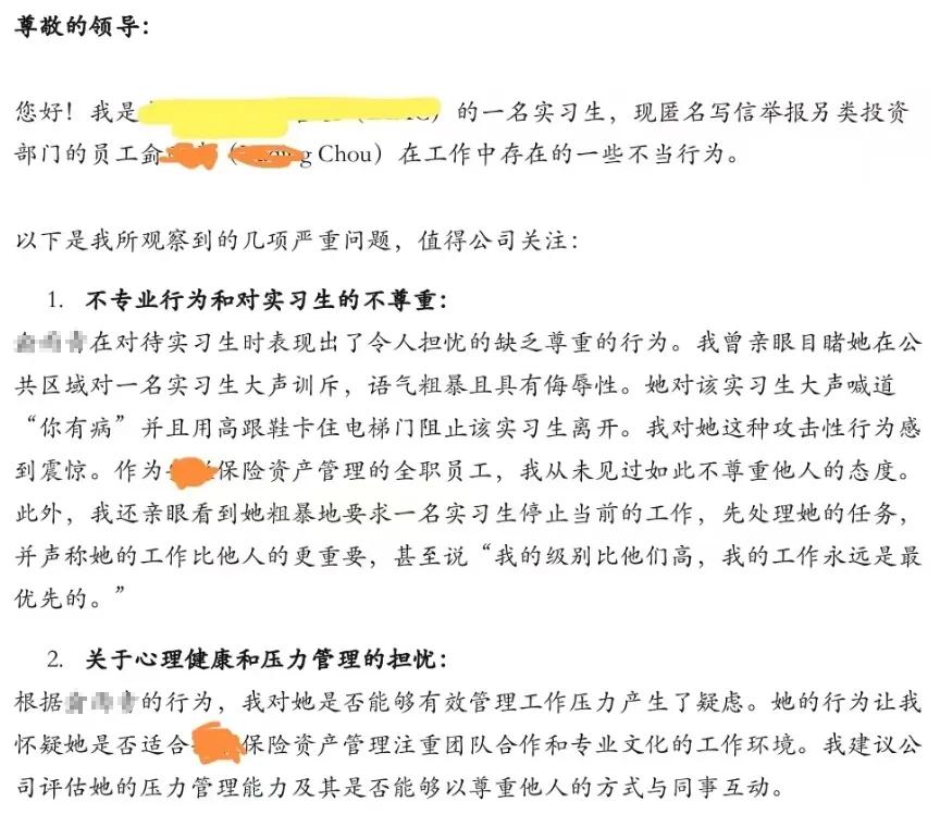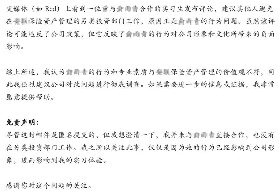 近日,一封匿名举报信在网络上悄然流传,将 AL 保险资管公司另类投资部门员工侴某推到了舆论的风口浪尖,信中所揭露的种种问题,令人对该公司的内部管理和职场生态产生了深深的担忧。