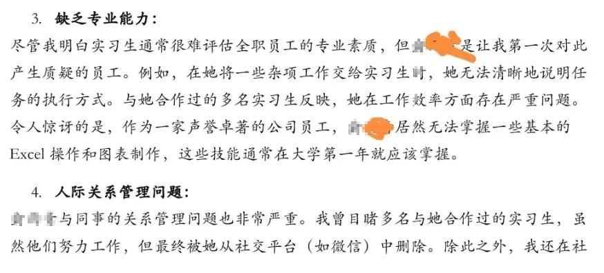 在专业能力方面,侴某同样表现欠佳。虽然实习生通常不会轻易评判全职员工的专业素质,但侴某却让人不得不产生质疑。她在给实习生安排杂项工作时,连任务的执行方式都无法清晰说明,导致实习生在工作中常常摸不着头脑。而且,与她合作过的多名实习生都反映,她在工作效率上存在严重问题。令人难以置信的是,作为一家声誉卓著的公司员工,她竟然连大学一年级学生就应掌握的基本 Excel 操作和图表制作都不熟练,这与公司对专业人才的要求相差甚远。